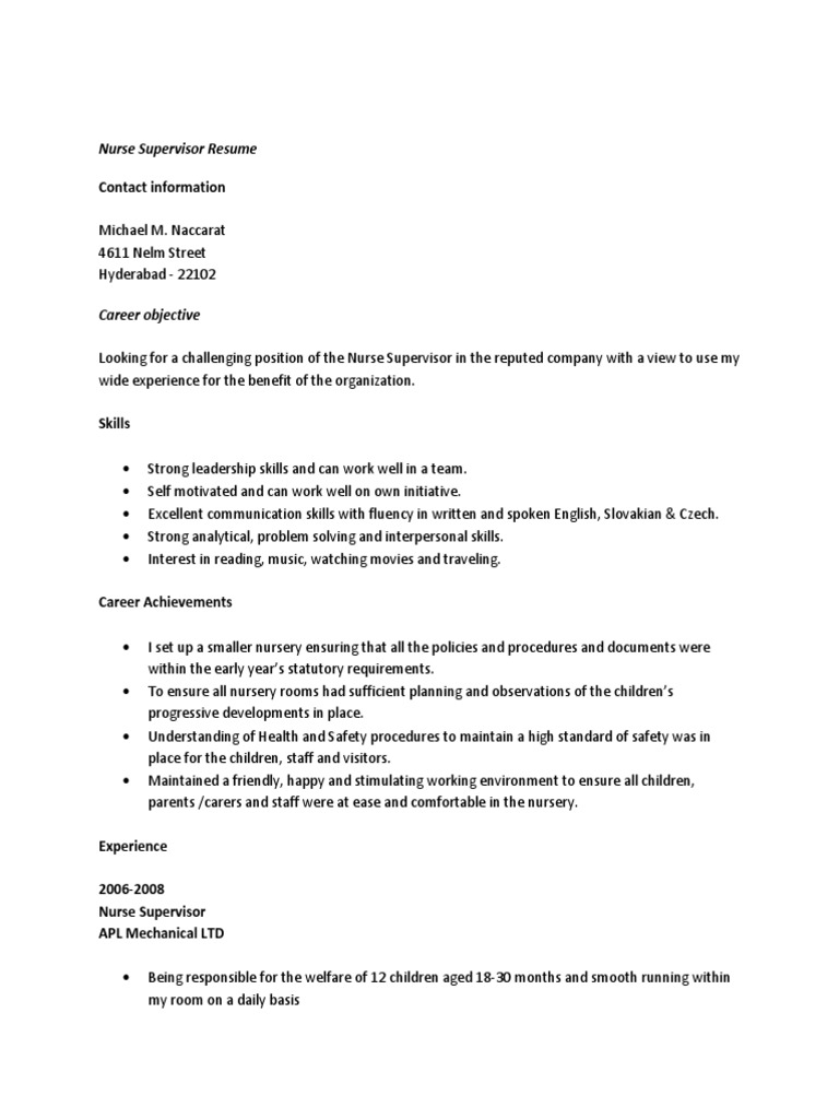 Charge Nurse Manager Cv July 2021 from www.velvetjobs.com To help your nursing skills and experience shine, view this sample resume for an rn below, and download the nurse resume template in word. As a supervisor, you know the value of a strong, clear goal. Mar 13, 2020 · highlighting supervisor skills on your resume can showcase your leadership and management skills so hiring managers will consider you for a supervisor role within their company. Profession registered nurse with over 4 years experience in different areas. When writing a resume or cv for the position of a supervisor, the quality of your objective statement can be a deciding factor on whether your resume is read or not. Jobs for nurses are projected to grow by 15% (or 438,100 jobs) from 2016 through 2026, which is much faster than average, according to the bureau of labor statistics (bls). The five roles of a supervisor if you are charged with managing others' performance, including conducting performance evaluations, you are considered to be a uva supervisor. Top 22 supervisor resume objective examples you can use.